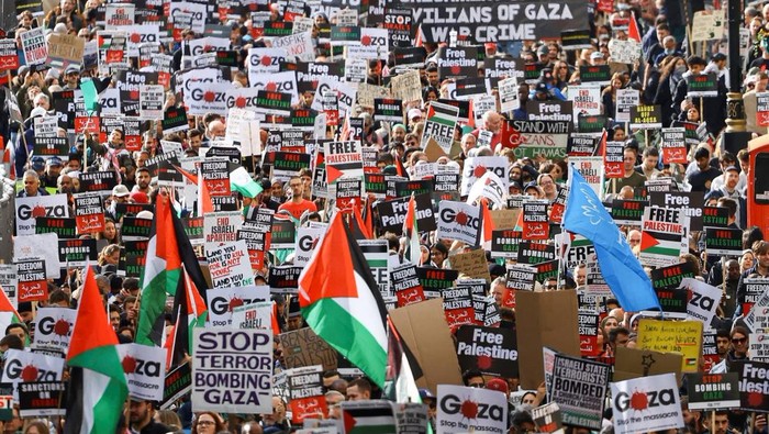 Di Inggris, puluhan ribu demonstran pro-Palestina melakukan unjuk rasa pada di tengah hujan lebat di London untuk menuntut Israel menghentikan pemboman terhadap Gaza.