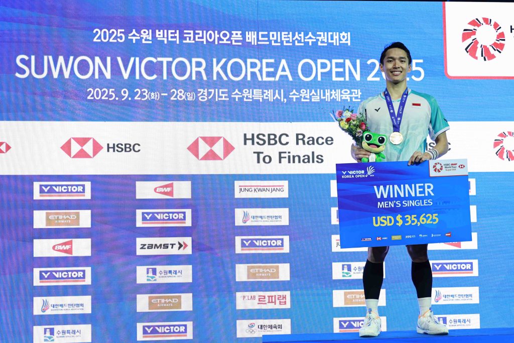 JAKARTA – Jonatan Christie juara Korea Open 2025 setelah mengalahkan Anders Antonsen dalam final di Suwon Gimnasium, Suwon, Minggu (28/9/2025). Jonatan menang 21-10, 15-21, 21-17 dalam waktu 75 menit.