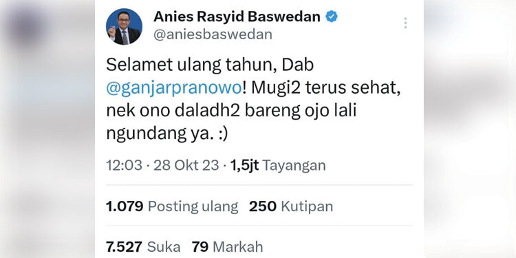 JAKARTA – Bacapres Anies Baswedan, melalui akun media sosial X @aniesbaswedan mengucapkan selamat ulang tahun kepada kompetitornya, Bacapres Ganjar Pranowo.